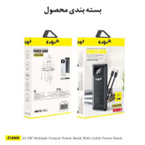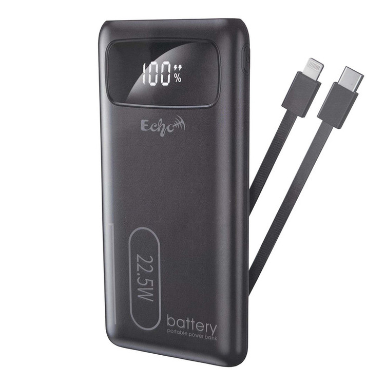 پاور بانک ECHO مدل E10000 به همراه 2 کابلTYPE-C و لایتنینگ) متصل به بدنه شما رو بی نیاز از کابل می کند، علاوه بر کابل های متصل به پاور در این محصول یک درگاه خروجی در نظر گرفته شده است که شدت جریان خروجی در آن 2 آمپر است و دیگری Type-C است و میتوانید با شارژر مناسب ترجیحاً 3 آمپر و بیشتر این پاوربانک را شارژر کنید و یا حتی توسط کابل تایپ سی از این درگاه گوشی خودرا شارژ کنید. این محصول با انواع گجتهای هوشمند مثل دوربین، تبلت، گوشی سازگار است. بر روی بدنه پاوربانک نشانگرهای LED میزان شارژ تعبیه شده است که با نمایش وضعیت شارژ نشان می دهد.میزان ولتاژ ورودی و خروجی در آن 5-9و12 ولت متغییر است که متناسب با شارژر شما به صورت اتماتیک تعیین میشود.همچنین این محصول با بهره گرفتن از پردازنده ساخت اکو به صورت هوشمند در برابر افزایش ولتاژ، دما و جریان محافظت شده است.