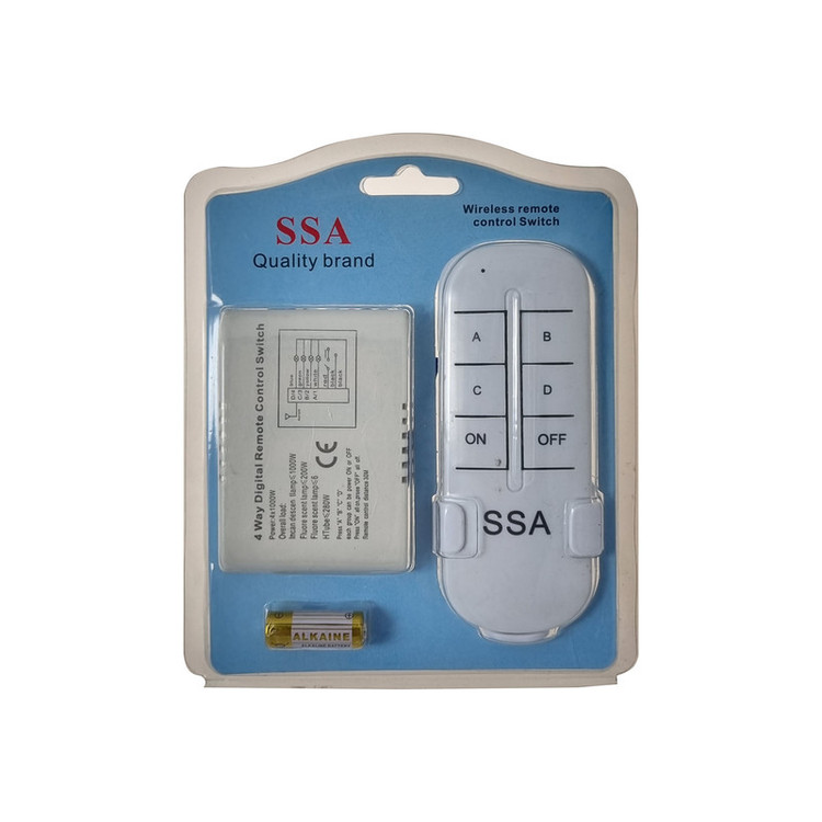 ریموت کنترل 4 کانال مدل ssa با خروجی 220 ولت مناسب برای خاموش و روشن نمودن انواع وسایل برقی مانند لامپ و لوستر و ... است. این ریموت 6 کلید دارد که دو کلید مخصوص روشن و خاموش کردن و 4 کلید دیگر مخصوص کانال های مورد استفاده می باشد، قابلیت های این ریموت بسیار متفاوت و خیلی کاربردی می باشد. هر کدام از این کانال ها 1000 وات توان خروجی دارند و می توان به صورت مجزا از هر کانال استفاده کرد، مثلا به عنوان ریموت روشنایی منزل و درب برقی و هر وسیله ای که ماکزیمم توان مصرفی 1000 وات داشته باشد. طریقه نصب محصول مطابق نقشه ای که بر روی گیرنده ها قرار دارد می باشد .